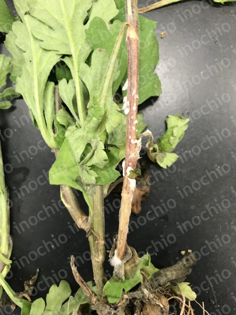 菌核病は、キクの地際部の茎や葉の先端部から発生するのが大きな特徴です。