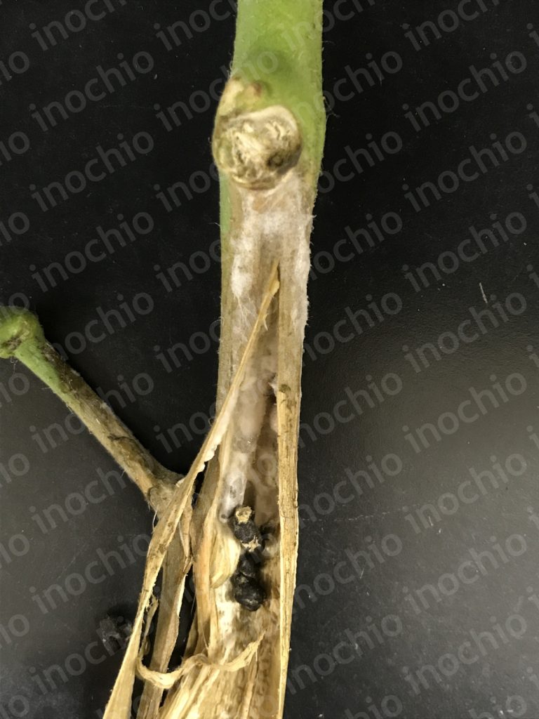 最も特徴的なのは、罹病した茎の外側や内部に形成される黒いネズミの糞状の菌核で、これが翌年以降の重要な伝染源になります。