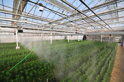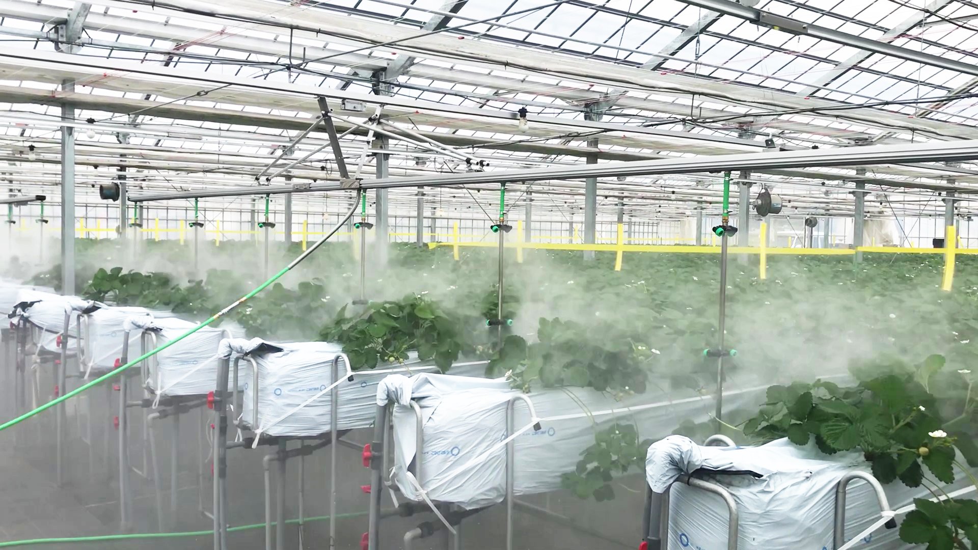 マスプレーは、農業用ビニールハウス内における自走式防除・灌水システムです。定期的な防除作業、灌水作業を自動化することができ、労力・作業時間の短縮につながります。手散布に比べ、散布時に空中に漂う農薬の微粉末や霧を吸い込むリスクを軽減できます。葉に水をかけることで気化熱を利用し、葉の温度を下げるといった使い方もできます。